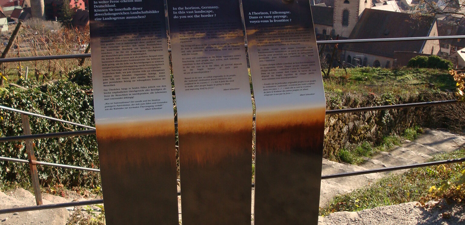 Ce parcours initiatique vous plonge dans la vie d'un homme engagé, écologiste et profondément humain. Ses pensées invitent à la réflexion : le respect de la vie et de la nature, l'enfance et bien d'autres… le sentier est composé d’une dizaine de « totems » placés en des points bien choisis dans Kaysersberg, portant chacun une suite de réflexions et d’interrogations sans réponses, éclairées par une citation d’Albert Schweitzer – en français, allemand et anglais. Chaque panneau a son thème selon le lieu où il se trouve et veut inciter le visiteur-lecteur à se poser des questions.